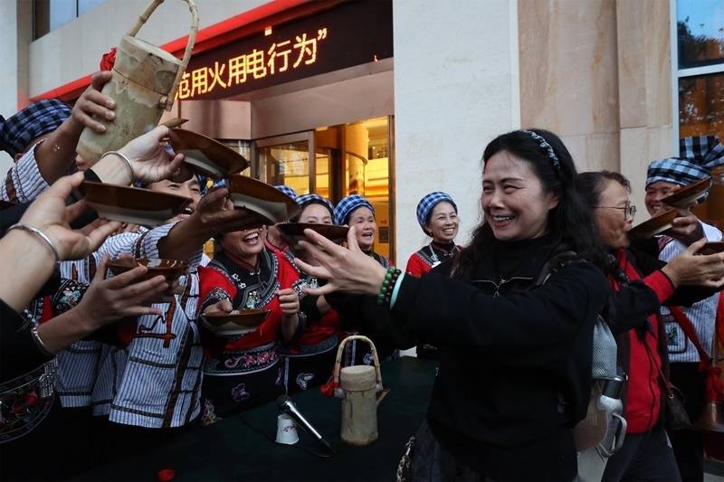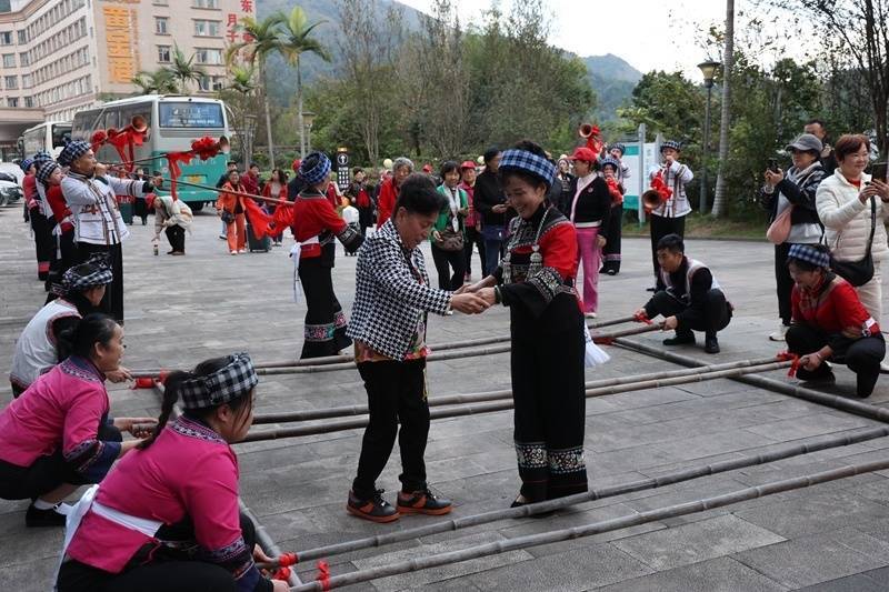 川渝游客体验民族特色“竹竿舞”。