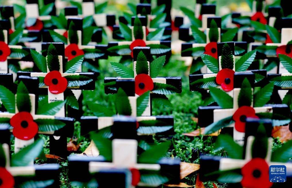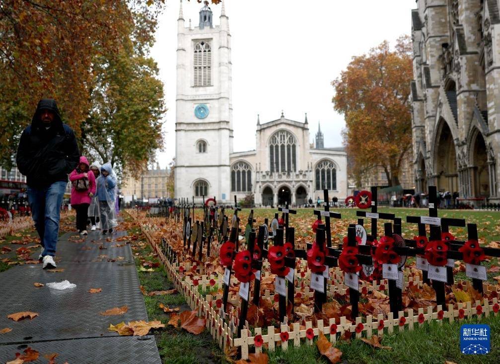 这是11月10日在英国伦敦威斯敏斯特教堂外拍摄的悼念标识。