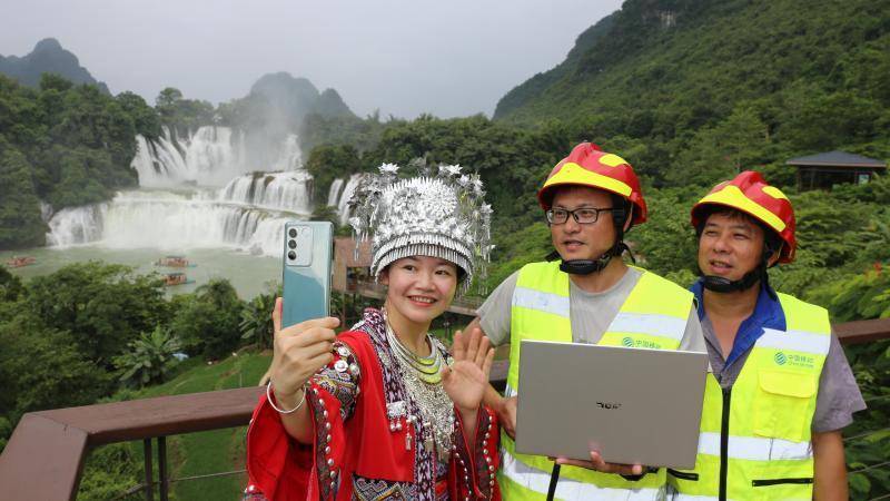 在中越边境的跨国瀑布—崇左市大新县的德天瀑布,移动技术专家正在保障旅游直播间的现场网络。广西移动供图